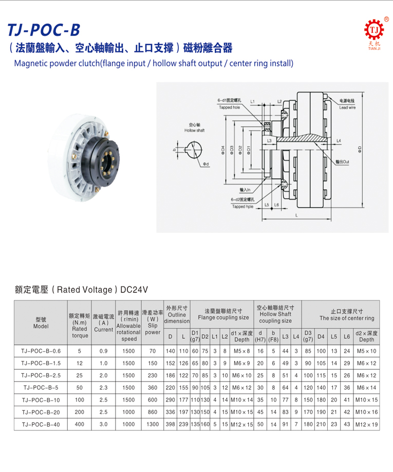 中空軸磁粉離合器(法蘭盤輸入磁粉離合器)型號為TJ-POC-B,規(guī)格有0.6KG、1.5KG、2.5KG、5KG、10KG、20KG、40KG;對應(yīng)的額定轉(zhuǎn)矩為:6Nm、12Nm、25Nm、50Nm、100Nm、200Nm、400Nm等更大型號規(guī)格的轉(zhuǎn)矩,采用的都是DC24V直流電壓。
